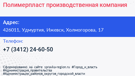 Полимерпласт, производственная компания по адресу 426011, Удмуртия, Ижевск, Холмогорова, 17 в дальнейшем Организация, размещена в следующих категориях: