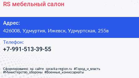 RS, мебельный салон по адресу 426008, Удмуртия, Ижевск, Удмуртская, 255в в дальнейшем Организация, размещена в следующих категориях: