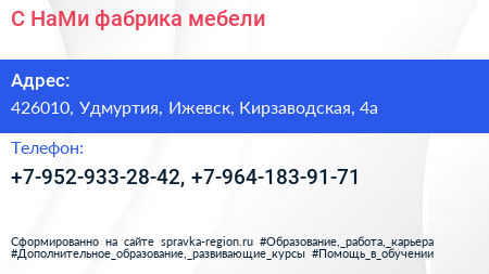 С НаМи, фабрика мебели по адресу 426010, Удмуртия, Ижевск, Кирзаводская, 4а в дальнейшем Организация, размещена в следующих категориях: