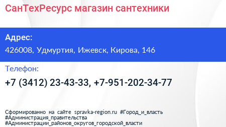СанТехРесурс, магазин сантехники по адресу 426008, Удмуртия, Ижевск, Кирова, 146 в дальнейшем Организация, размещена в следующих категориях: