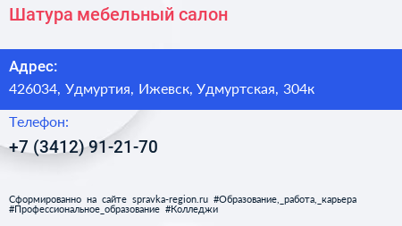 Шатура, мебельный салон по адресу 426034, Удмуртия, Ижевск, Удмуртская, 304к в дальнейшем Организация, размещена в следующих категориях: