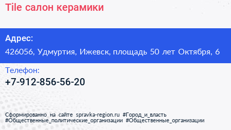 Tile, салон керамики по адресу 426056, Удмуртия, Ижевск, площадь 50 лет Октября, 6 в дальнейшем Организация, размещена в следующих категориях: