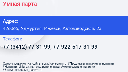 Для связи с организацией воспользуйтесь номером телефона: +7 (3412) 77-31-99, +7-922-517-31-99. Ежедневно с 10:00 до 21:00, вы можете обратиться в эту организацию.