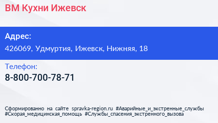 ВМ Кухни Ижевск по адресу 426069, Удмуртия, Ижевск, Нижняя, 18 в дальнейшем Организация, размещена в следующих категориях: