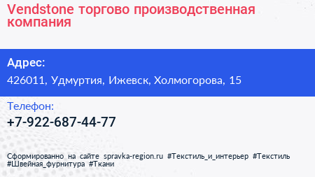 Vendstone, торгово-производственная компания по адресу 426011, Удмуртия, Ижевск, Холмогорова, 15 в дальнейшем Организация, размещена в следующих категориях: