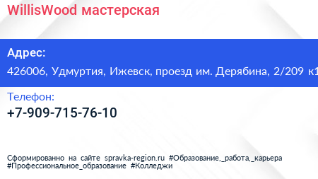 WillisWood, мастерская по адресу 426006, Удмуртия, Ижевск, проезд им. Дерябина, 2/209 к1 в дальнейшем Организация, размещена в следующих категориях: