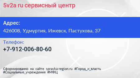 5v2a.ru, сервисный центр по адресу 426008, Удмуртия, Ижевск, Пастухова, 37 в дальнейшем Организация, размещена в следующих категориях: