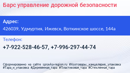 Барс, управление дорожной безопасности по адресу 426039, Удмуртия, Ижевск, Воткинское шоссе, 144а в дальнейшем Организация, размещена в следующих категориях: