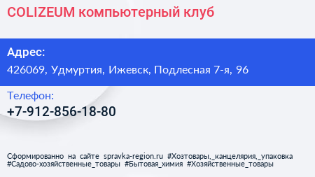 COLIZEUM, компьютерный клуб по адресу 426069, Удмуртия, Ижевск, Подлесная 7-я, 96 в дальнейшем Организация, размещена в следующих категориях: