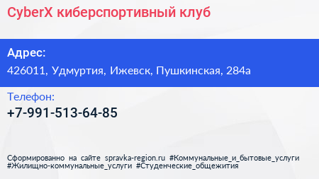 CyberX, киберспортивный клуб по адресу 426011, Удмуртия, Ижевск, Пушкинская, 284а в дальнейшем Организация, размещена в следующих категориях:
