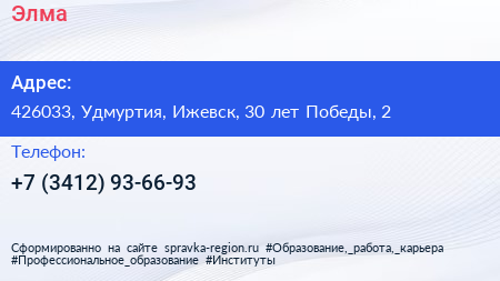 Элма по адресу 426033, Удмуртия, Ижевск, 30 лет Победы, 2 в дальнейшем Организация, размещена в следующих категориях: