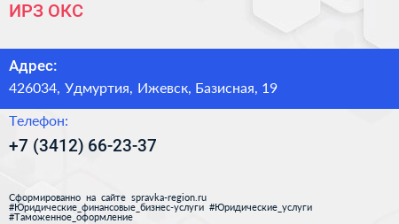 ИРЗ-ОКС по адресу 426034, Удмуртия, Ижевск, Базисная, 19 в дальнейшем Организация, размещена в следующих категориях: