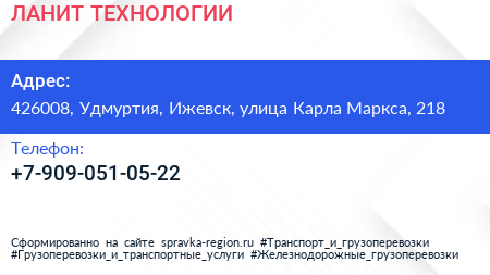 ЛАНИТ-ТЕХНОЛОГИИ по адресу 426008, Удмуртия, Ижевск, улица Карла Маркса, 218 в дальнейшем Организация, размещена в следующих категориях: