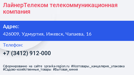 ЛайнерТелеком, телекоммуникационная компания по адресу 426009, Удмуртия, Ижевск, Чапаева, 16 в дальнейшем Организация, размещена в следующих категориях: