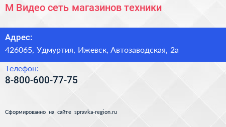 М.Видео, сеть магазинов техники по адресу 426065, Удмуртия, Ижевск, Автозаводская, 2а в дальнейшем Организация, размещена в следующих категориях: