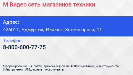 М.Видео, сеть магазинов техники по адресу 426011, Удмуртия, Ижевск, Холмогорова, 11 в дальнейшем Организация, размещена в следующих категориях: