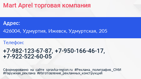 Mart-Aprel, торговая компания по адресу 426004, Удмуртия, Ижевск, Удмуртская, 205 в дальнейшем Организация, размещена в следующих категориях: