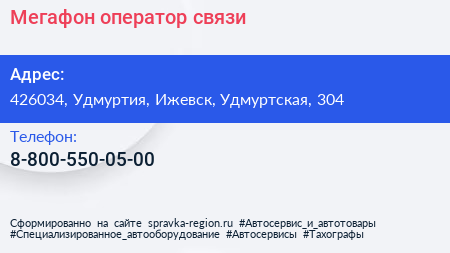 Мегафон, оператор связи по адресу 426034, Удмуртия, Ижевск, Удмуртская, 304 в дальнейшем Организация, размещена в следующих категориях: