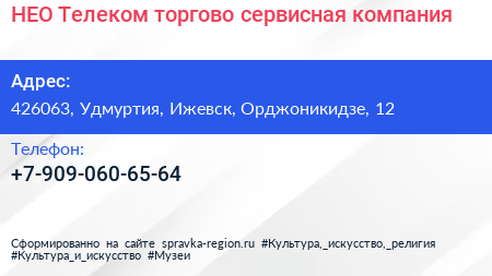 НЕО-Телеком, торгово-сервисная компания по адресу 426063, Удмуртия, Ижевск, Орджоникидзе, 12 в дальнейшем Организация, размещена в следующих категориях: