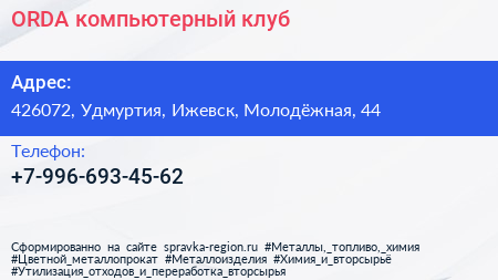 ORDA, компьютерный клуб по адресу 426072, Удмуртия, Ижевск, Молодёжная, 44 в дальнейшем Организация, размещена в следующих категориях: