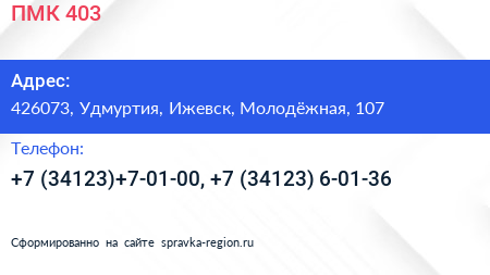 ПМК-403 по адресу 426073, Удмуртия, Ижевск, Молодёжная, 107 в дальнейшем Организация, размещена в следующих категориях: