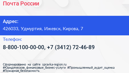 Почта России по адресу 426033, Удмуртия, Ижевск, Кирова, 7 в дальнейшем Организация, размещена в следующих категориях: