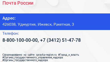 Почта России по адресу 426038, Удмуртия, Ижевск, Ракетная, 3 в дальнейшем Организация, размещена в следующих категориях: