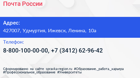 Почта России по адресу 427007, Удмуртия, Ижевск, Ленина, 10а в дальнейшем Организация, размещена в следующих категориях: