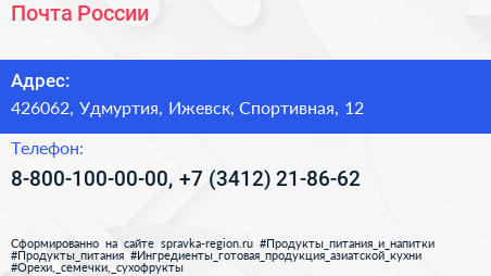 Почта России по адресу 426062, Удмуртия, Ижевск, Спортивная, 12 в дальнейшем Организация, размещена в следующих категориях:
