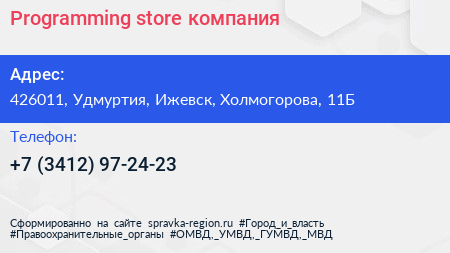 Programming store, компания по адресу 426011, Удмуртия, Ижевск, Холмогорова, 11Б в дальнейшем Организация, размещена в следующих категориях: