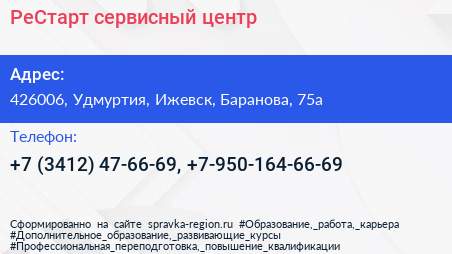 РеСтарт, сервисный центр по адресу 426006, Удмуртия, Ижевск, Баранова, 75а в дальнейшем Организация, размещена в следующих категориях:
