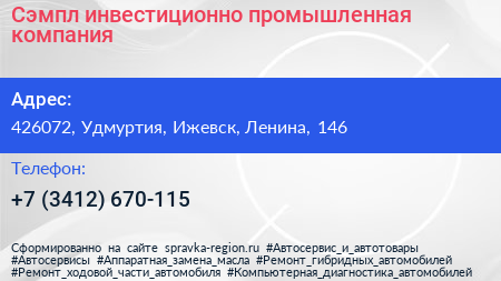 Сэмпл, инвестиционно-промышленная компания по адресу 426072, Удмуртия, Ижевск, Ленина, 146 в дальнейшем Организация, размещена в следующих категориях: