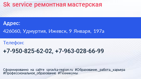 Sk-service, ремонтная мастерская по адресу 426060, Удмуртия, Ижевск, 9 Января, 197а в дальнейшем Организация, размещена в следующих категориях: