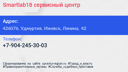 Smartlab18, сервисный центр по адресу 426076, Удмуртия, Ижевск, Ленина, 42 в дальнейшем Организация, размещена в следующих категориях: