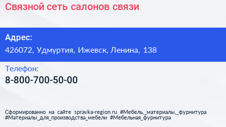 Связной, сеть салонов связи по адресу 426072, Удмуртия, Ижевск, Ленина, 138 в дальнейшем Организация, размещена в следующих категориях: