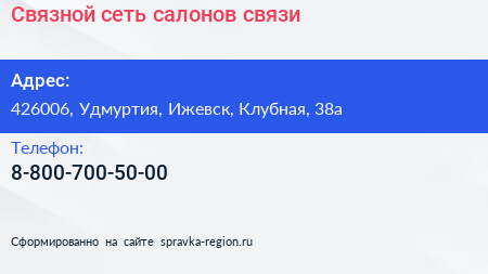 Связной, сеть салонов связи по адресу 426006, Удмуртия, Ижевск, Клубная, 38а в дальнейшем Организация, размещена в следующих категориях:
