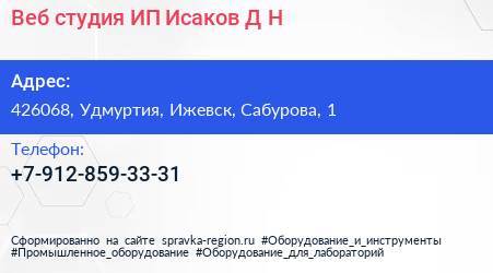 Веб-студия, ИП Исаков Д.Н. по адресу 426068, Удмуртия, Ижевск, Сабурова, 1 в дальнейшем Организация, размещена в следующих категориях: