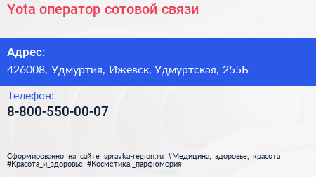 Yota, оператор сотовой связи по адресу 426008, Удмуртия, Ижевск, Удмуртская, 255Б в дальнейшем Организация, размещена в следующих категориях: