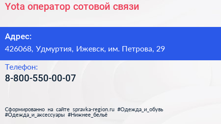 Yota, оператор сотовой связи по адресу 426068, Удмуртия, Ижевск, им. Петрова, 29 в дальнейшем Организация, размещена в следующих категориях: