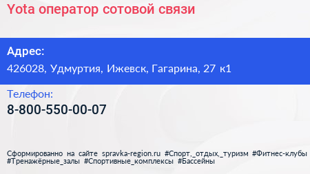 Yota, оператор сотовой связи по адресу 426028, Удмуртия, Ижевск, Гагарина, 27 к1 в дальнейшем Организация, размещена в следующих категориях: