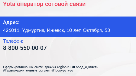 Yota, оператор сотовой связи по адресу 426011, Удмуртия, Ижевск, 10 лет Октября, 53 в дальнейшем Организация, размещена в следующих категориях: