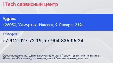 i-Tech, сервисный центр по адресу 426050, Удмуртия, Ижевск, 9 Января, 219а в дальнейшем Организация, размещена в следующих категориях: