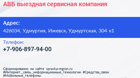 АВБ, выездная сервисная компания по адресу 426034, Удмуртия, Ижевск, Удмуртская, 304 к1 в дальнейшем Организация, размещена в следующих категориях:
