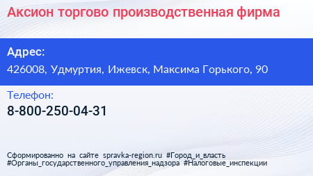 Аксион, торгово-производственная фирма по адресу 426008, Удмуртия, Ижевск, Максима Горького, 90 в дальнейшем Организация, размещена в следующих категориях: