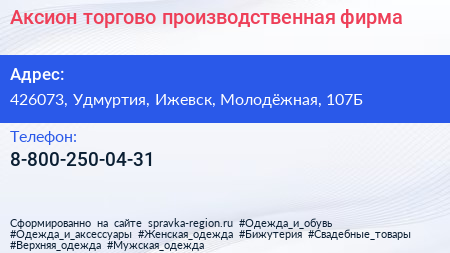 Аксион, торгово-производственная фирма по адресу 426073, Удмуртия, Ижевск, Молодёжная, 107Б в дальнейшем Организация, размещена в следующих категориях: