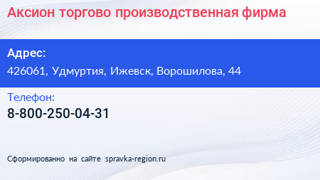 Аксион, торгово-производственная фирма по адресу 426061, Удмуртия, Ижевск, Ворошилова, 44 в дальнейшем Организация, размещена в следующих категориях: