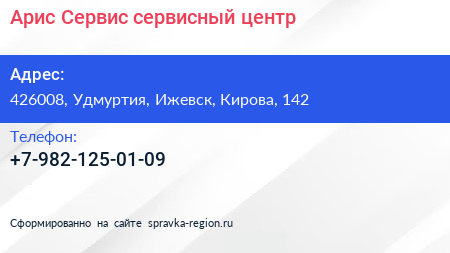 Арис Сервис, сервисный центр по адресу 426008, Удмуртия, Ижевск, Кирова, 142 в дальнейшем Организация, размещена в следующих категориях: