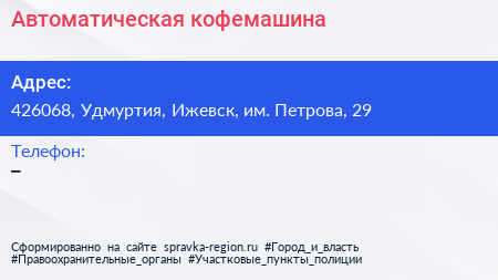 Автоматическая кофемашина по адресу 426068, Удмуртия, Ижевск, им. Петрова, 29 в дальнейшем Организация, размещена в следующих категориях: