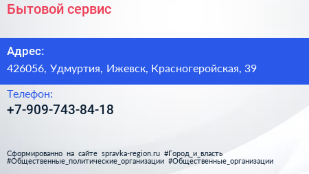 Бытовой сервис по адресу 426056, Удмуртия, Ижевск, Красногеройская, 39 в дальнейшем Организация, размещена в следующих категориях: