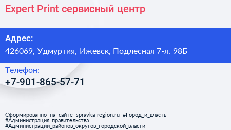 Expert Print, сервисный центр по адресу 426069, Удмуртия, Ижевск, Подлесная 7-я, 98Б в дальнейшем Организация, размещена в следующих категориях: